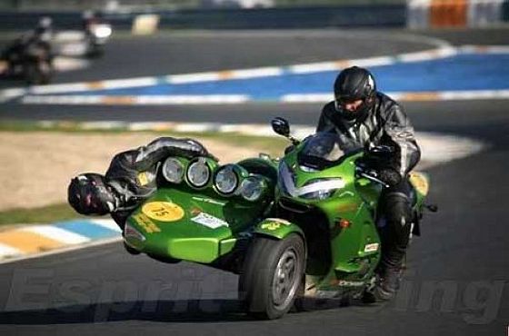 Toujours sur le Web, j’ai trouvé ce trike inversé, dont l’arrière est carrément une KAWASAKI ZRX 1100 qui pousse une coque monoplace avec deux roues devant :